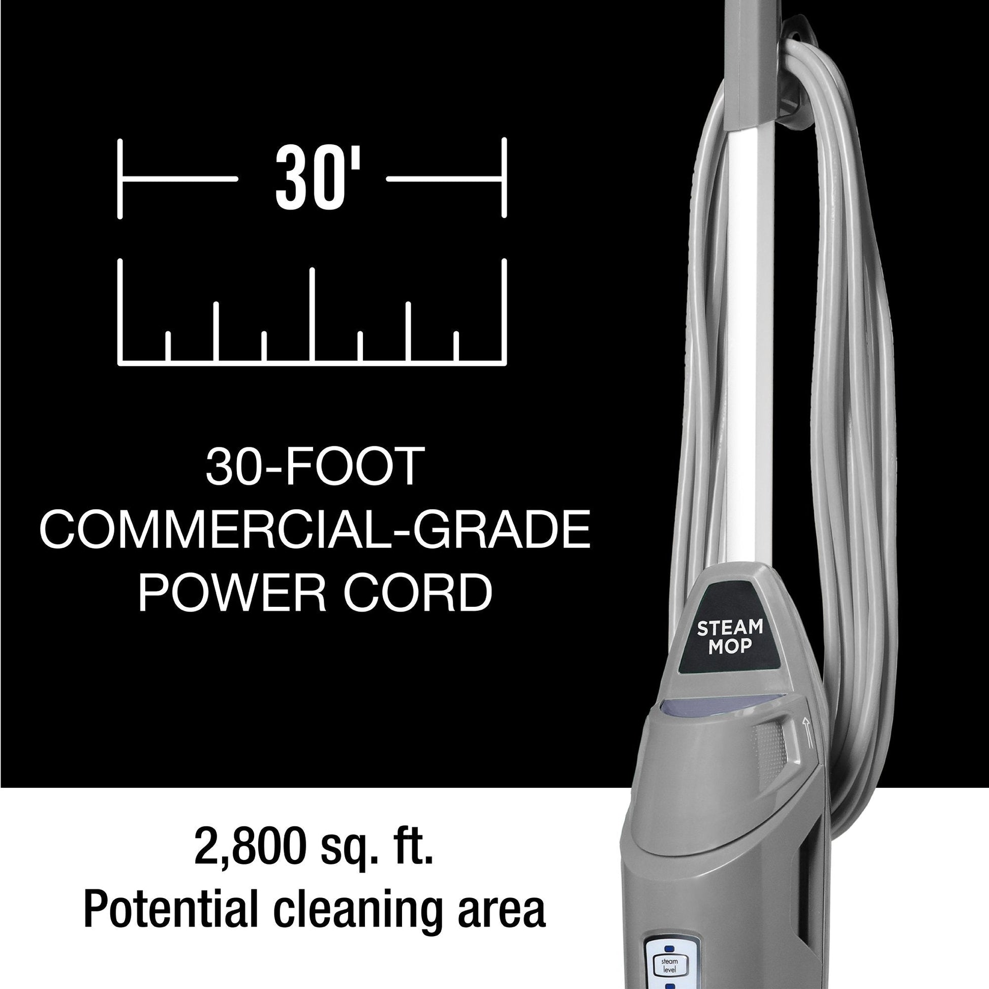 Includes a 30 ft. cord, removable water tank, and four washable microfiber mop pads